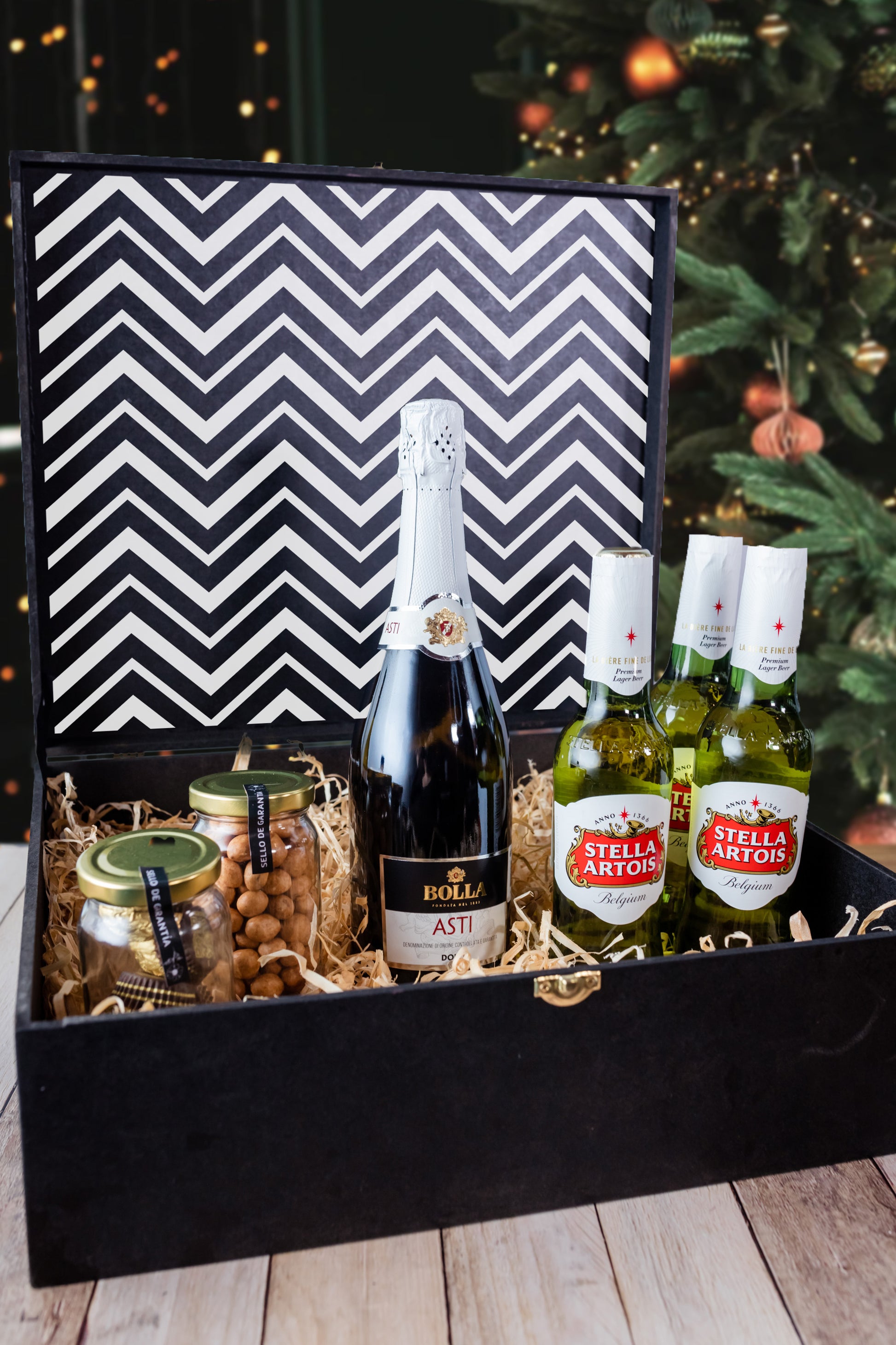 Enjoy the perfect combination of the sophisticated flavor of Bolla Asti sparkling wine, the crunchy texture of the finest roasted peanuts, and the irresistible sweetness of gourmet chocolates. This set comes carefully presented in an elegant black wooden box, ideal for gifting or turning any occasion into a unique experience.