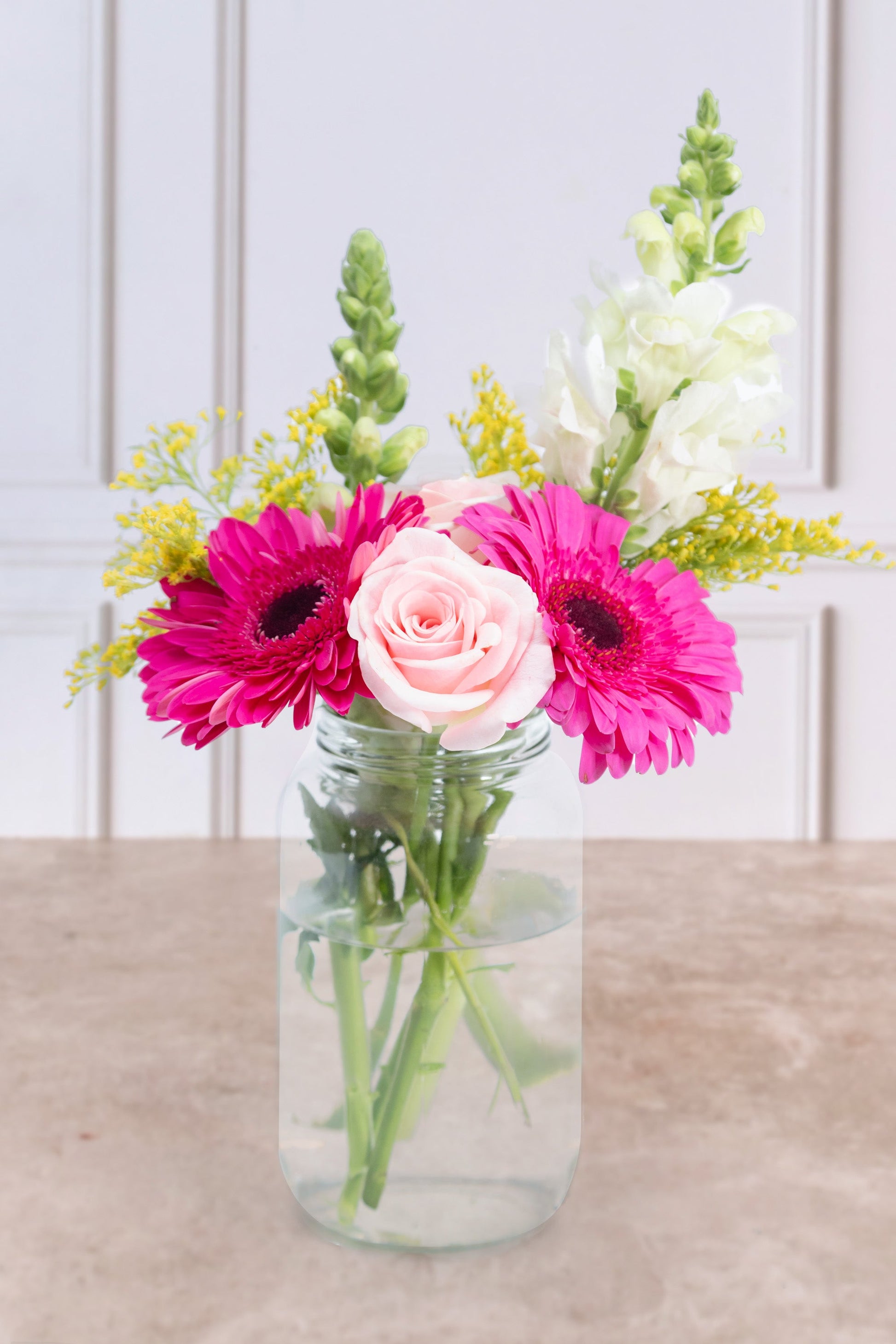 Add a colorful and elegant touch to your event with our gerbera daisy centerpieces in glass jars. The vibrant blooms offer a festive atmosphere, while the glass jar will add a modern touch to the decor. Perfect for any special occasion!