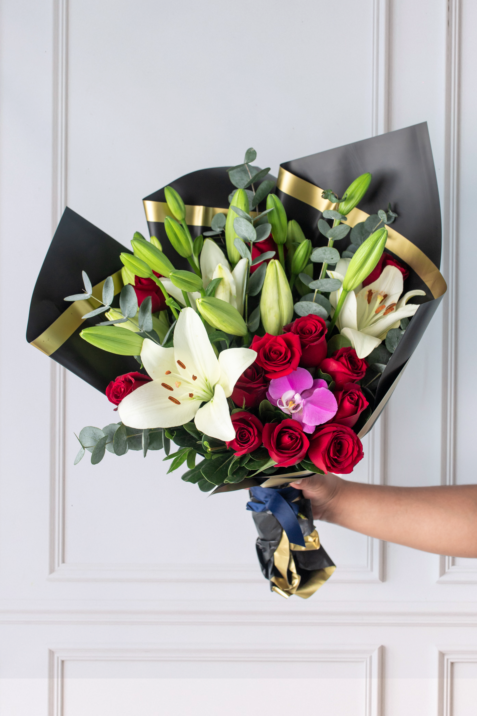Inspirado en la armonía y belleza de los jardines japoneses, Kioto es un ramo que une la pasión profunda de las rosas rojas con la pureza serena del lilium blanco.