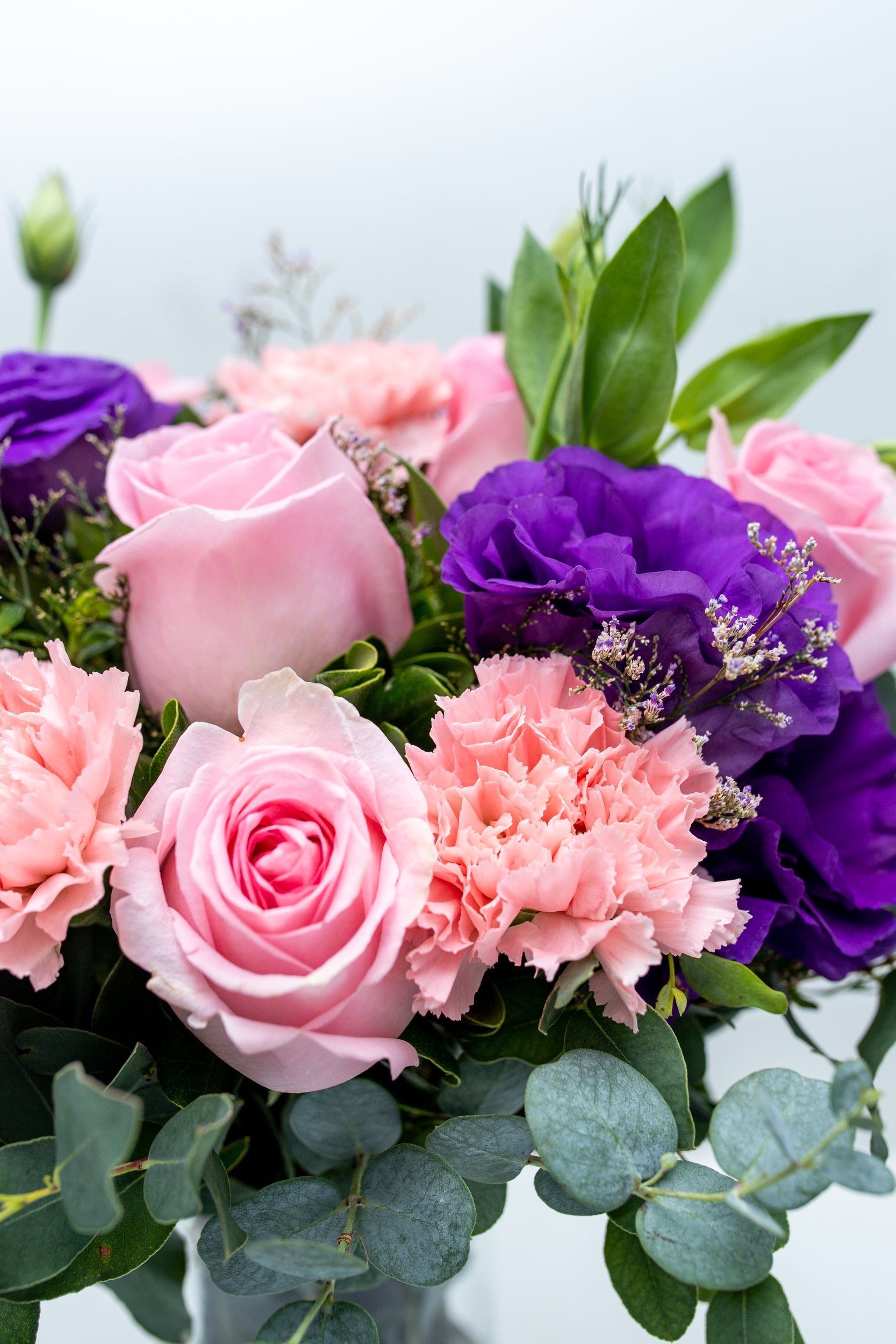 Un hermoso ramo donde los Claveles, las Rosas y Lisianthus son los protagonistas.