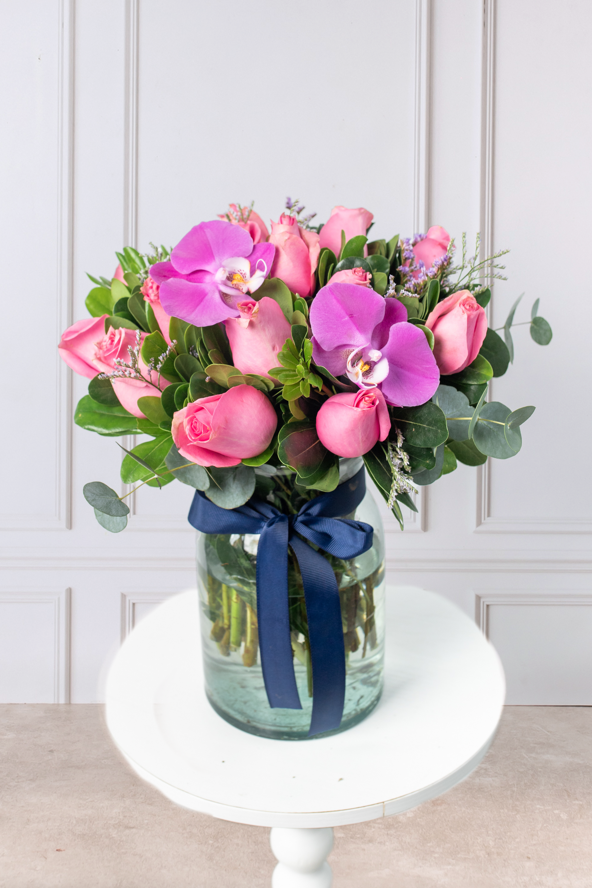Compuesto por la dulzura de la rosa clarita, símbolo de amor suave y afecto genuino, y la intensidad elegante de la orquídea morada, que representa admiración, respeto y misterio.