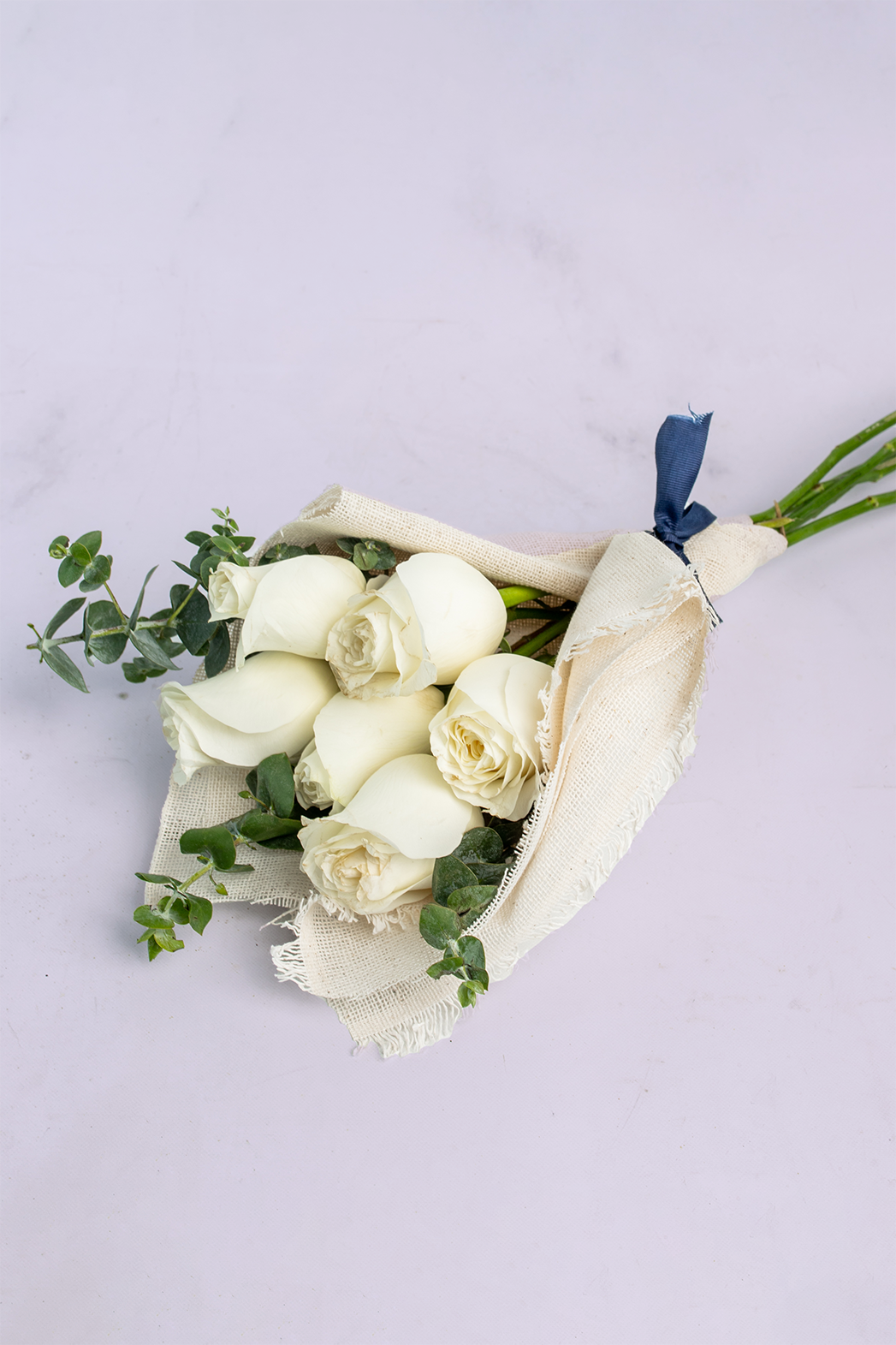 Elegancia y pureza se combinan en nuestro ramo de 6 rosas blancas, un detalle perfecto para expresar amor, gratitud o condolencias con sutileza y sofisticación. Cada rosa es cuidadosamente seleccionada para garantizar frescura y belleza, envuelta en un delicado forro de yute que aporta un toque natural y rústico.