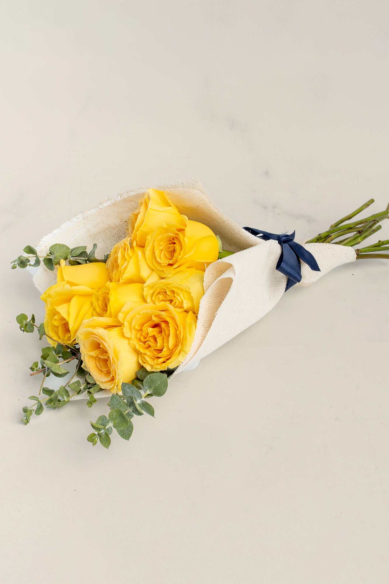 Ilumina cualquier ocasión con este hermoso arreglo de nueve rosas amarillas envueltas en elegante yute natural. Su vibrante color simboliza la alegría, la amistad y la energía positiva, convirtiéndolo en el detalle perfecto para sorprender a alguien especial.