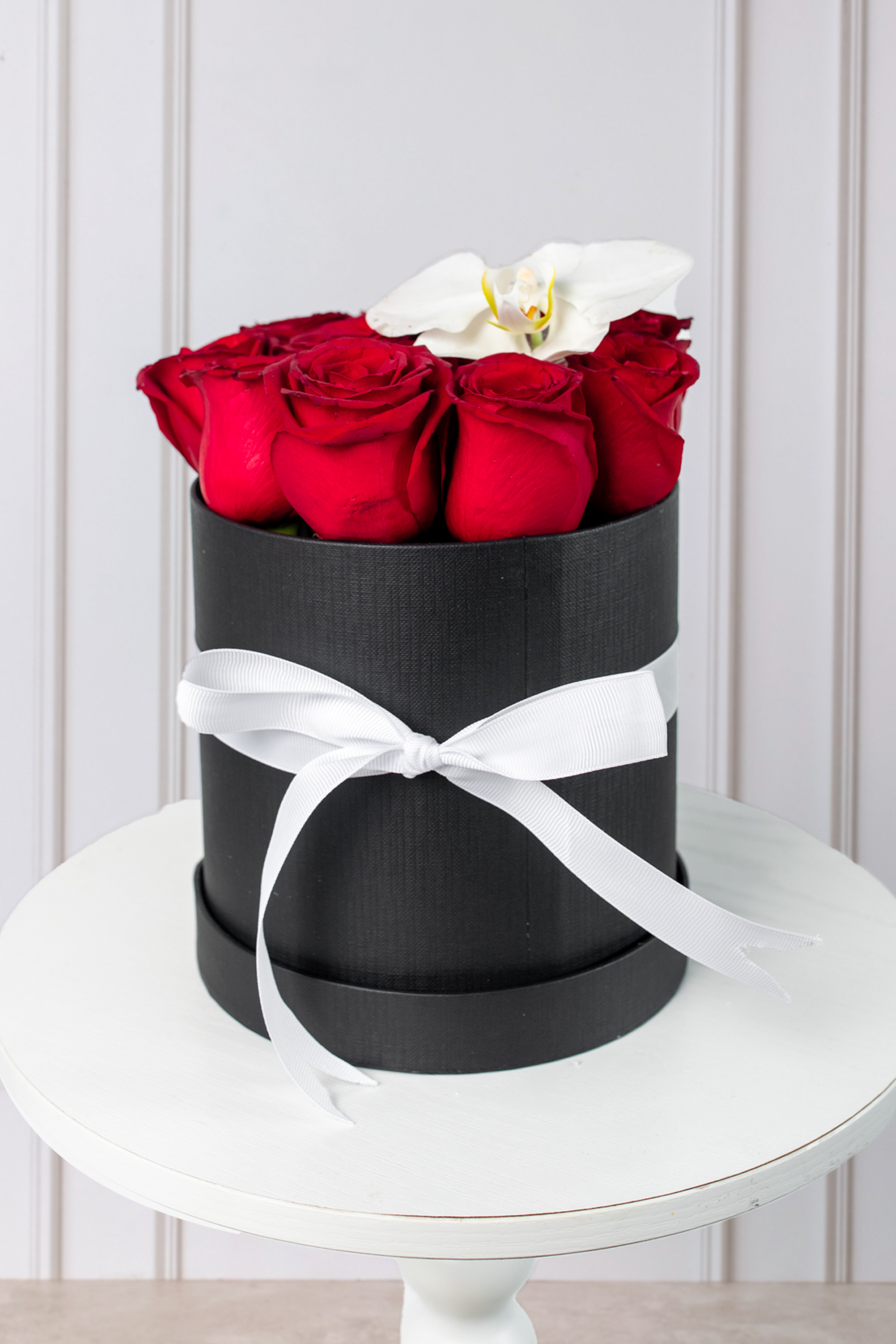 Señorita es una caja floral que combina la intensidad de las rosas rojas con la exótica belleza de la orquídea, creando un arreglo lleno de carácter, pasión y sutileza. Cada flor es seleccionada con cuidado y presentada en una caja sobria y femenina, ideal para sorprender con distinción.
