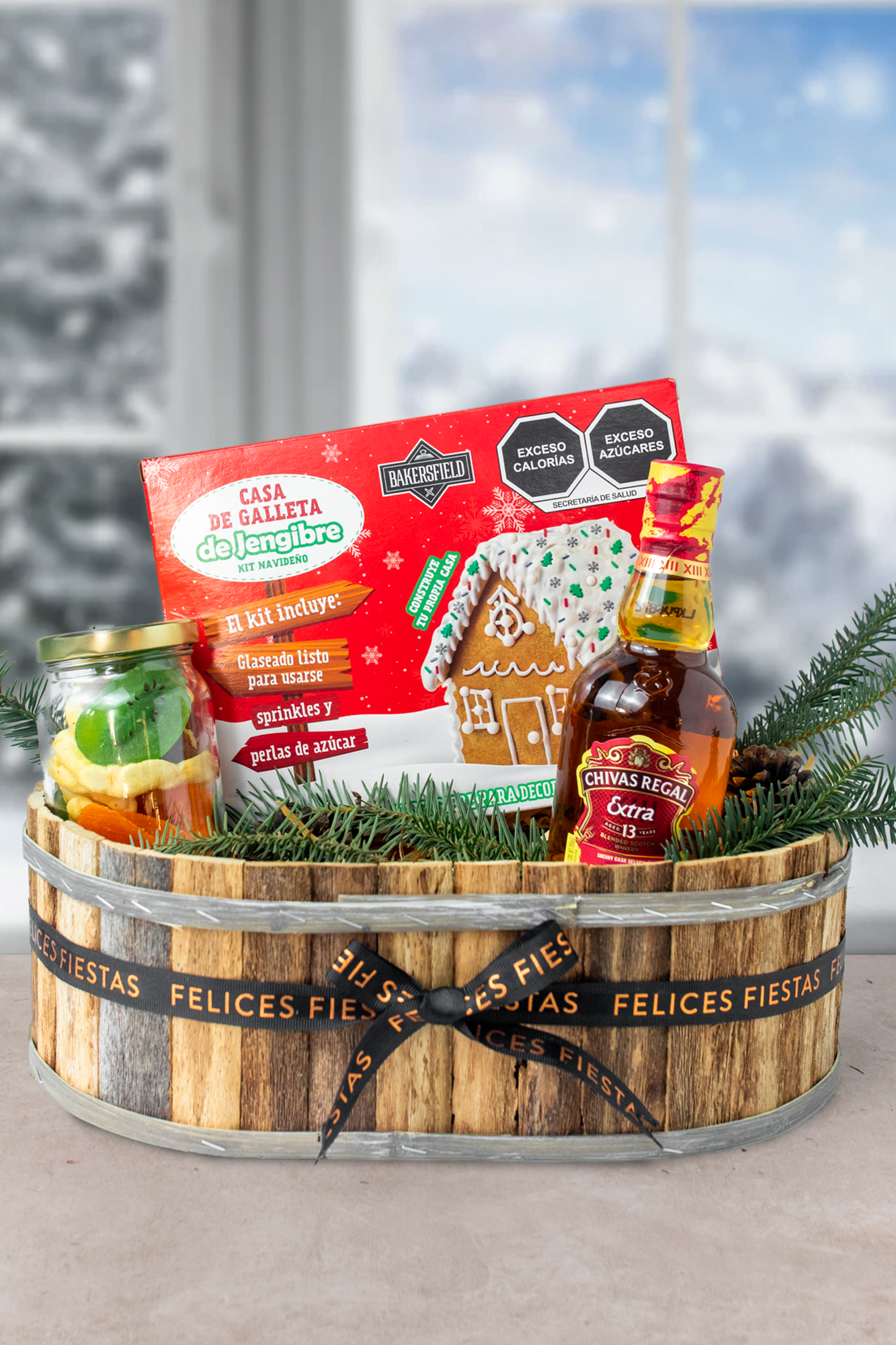 Una canasta creada para envolver la temporada en sabor, magia y buenos deseos. Sueños de Jengibre reúne una encantadora casita de galleta de jengibre, perfecta para llenar cualquier espacio de espíritu navideño; una elegante botella de Chivas Regal, ideal para brindar por los momentos que valen oro; y un delicado frasco de frutos deshidratados, pensados para acompañar tus brindis o endulzar una tarde invernal.